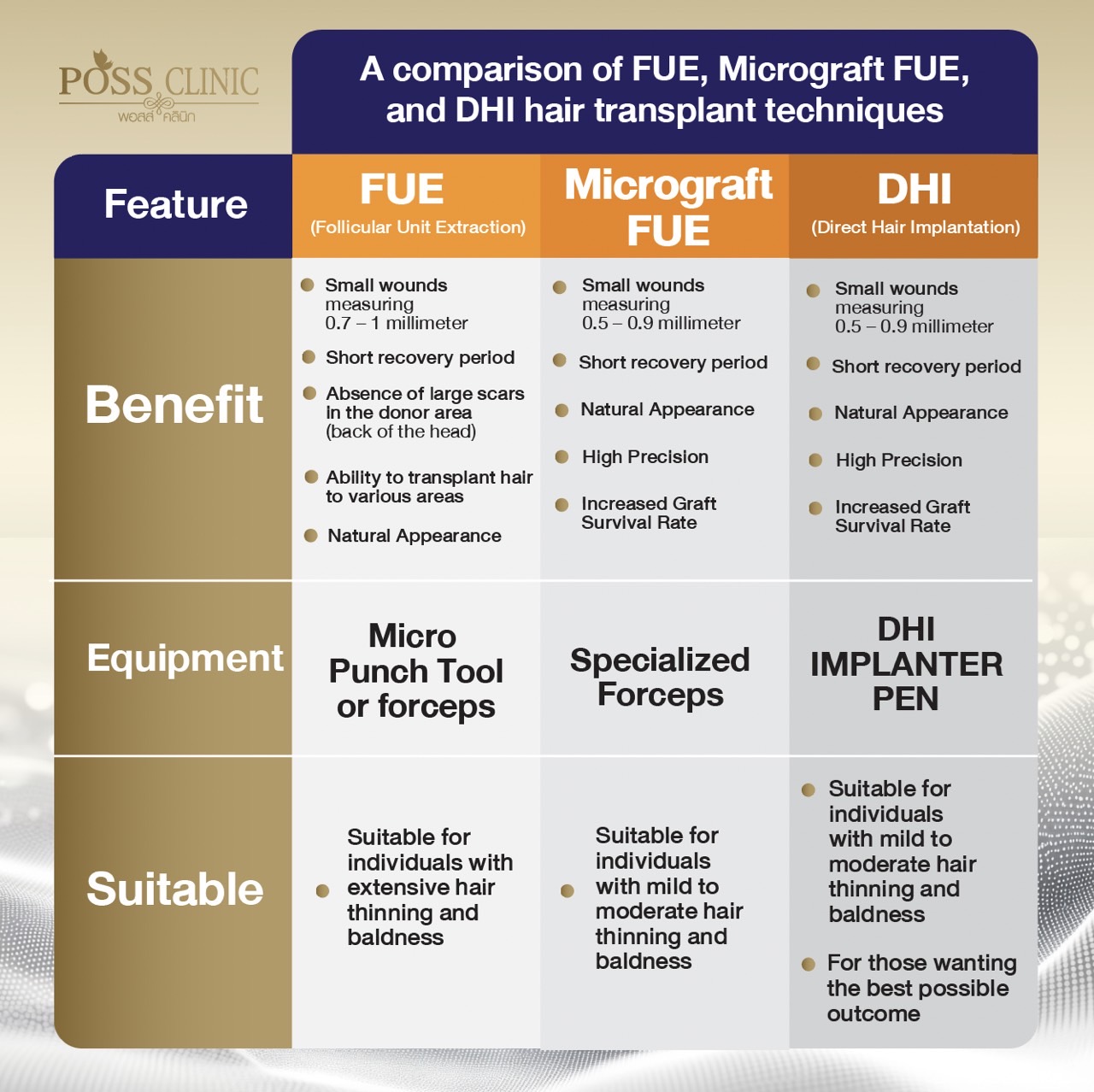 The results of all three techniques are similar, with a graft survival rate of approximately 70-95%. The differences lie in the graft preparation process and the refinement of the grafts. "Micrograft" and "DHI" both enhance refinement and density, hence the price differences.
